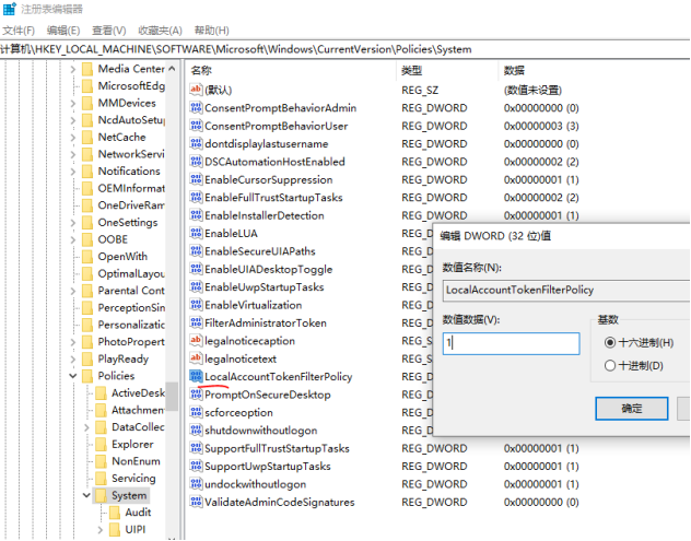 在注册表HKEY_LOCAL_MACHINESOFTWAREMicrosoftWindowsCurrentVersionPoliciesSystem中添加一个键值LocalAccountTokenFilterPolicy。LocalAccountTokenFilterPolicy默认不存在,即为0(开启远程限制),添加并设置为1时将关闭远程限制