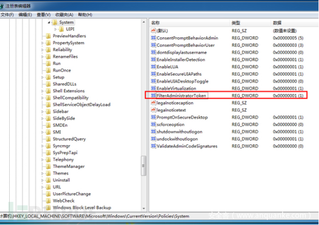 若要限制500用户administrator的远程登录,那就是直接把FilterAdministratorToken设置为1,路径为: