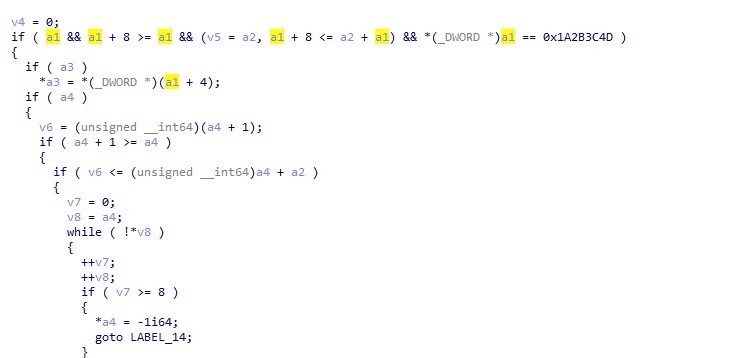 对传入缓冲区数据一顿判断(表示很疑惑,为什么对常识性的地址大小进行判断而不是其中的值,防止溢出??),另外将传入缓冲区得数据起始偏移为4得值拷贝到第三参数a3所在地址,很明显进入while循环后,由于block2之前已经初始化为0,那么循环8次后将a4置为-1,进入goto语句,返回0。