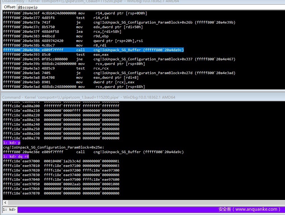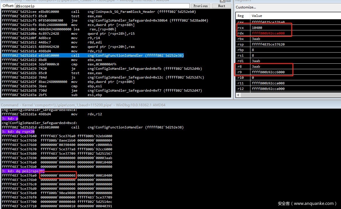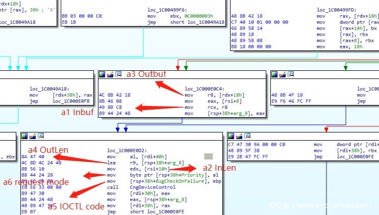 进入cng!CngDeviceControl 函数,大量判断IOCTL code之后,调用ConfigIoHandler_Safeguarded函数,传入前四参数即缓冲区相关四参数。