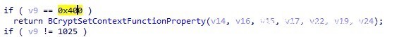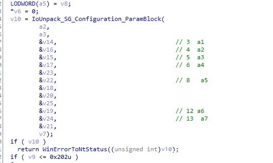 后续由于a1由原先的0x10400截断为0x400,调用BCryptSetContextFunctionProperty函数,传入七个参数分别为在IoUnpack_SG_Configuration_ParamBlock做赋值,v14为传入第3参数,被赋值为*(block1+8)