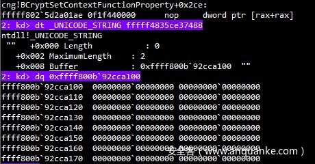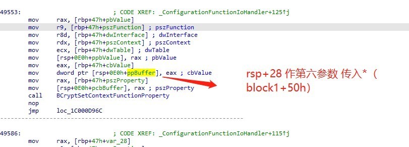 进入 BCryptSetContextFunctionProperty函数,最后两参数分别为(block1+50h),以及(block1+58h)。