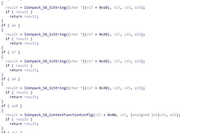我们进入ConfigurationFunctionIoHandler函数,首先映入眼帘的是一个熟悉的函数 IoUnpack_SG_Configuration_ParamBlock,估摸着和IoUnpack_SG_ParamBlock_Header函数有异曲同工之处。