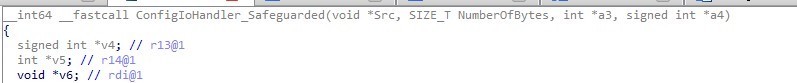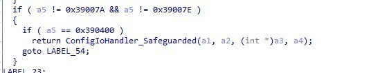 再回到ConfigIoHandler_Safeguarded函数中,接着调用ConfigFunctionIoHandler函数,将刚刚拿到的传入缓冲区地址偏移4处的值(0x10400)作为第一参数,block1地址作为第二参数,传入缓冲区大小InBufferLen作为第三参数,输出缓冲区地址作为第四参数,输出缓冲区大小为第五参数,block2地址作为第六参数。
