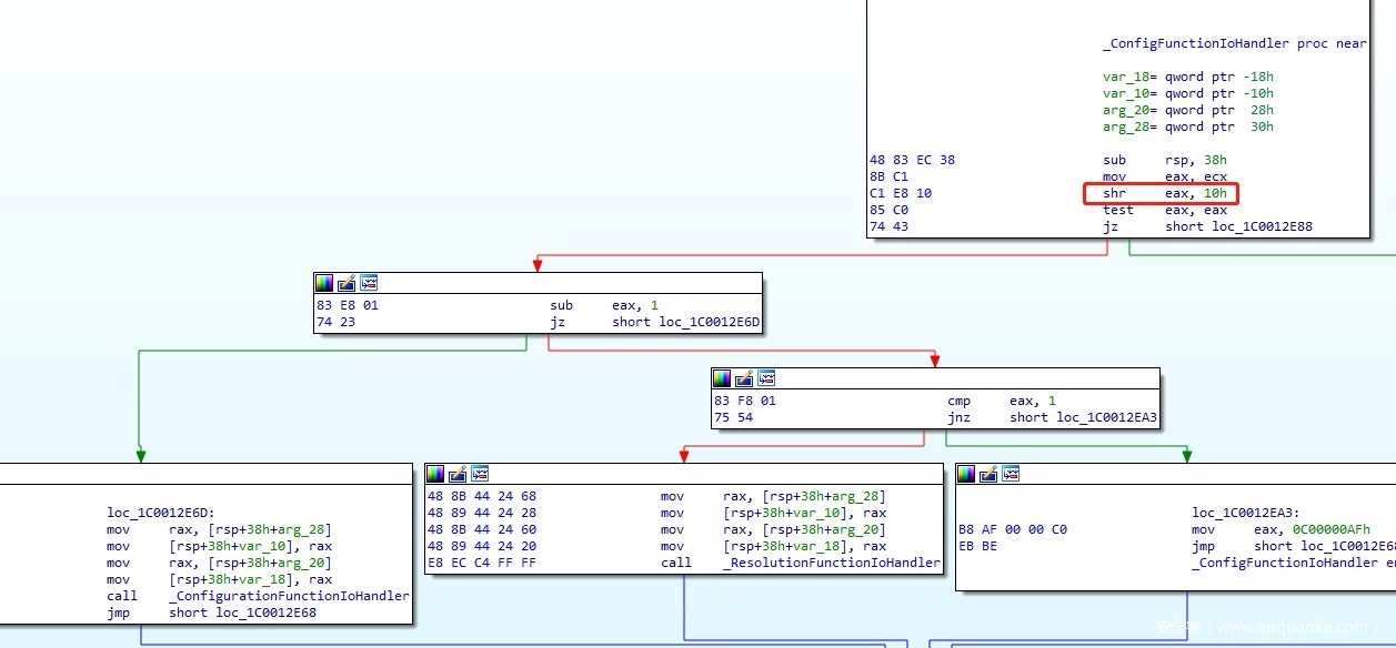 第一参数逻辑右移16位,结果为1(0x10000=<a1<0x1FFFF)时,调用ConfigurationFunctionIoHandler函数并传入6参数(注意a1变为两字节);