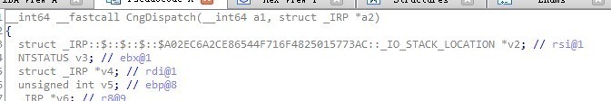 在调用CngDeviceControl 函数之前,主要a2的IRP数据进行处理,获取In/Out buffer地址以及Length,还有IOCTL code和RequestMode ,分别作为六个参数,传入CngDeviceControl 。通过调试来看,此派遣历程使用的操作模式Method为METHOD_BUFFERED。