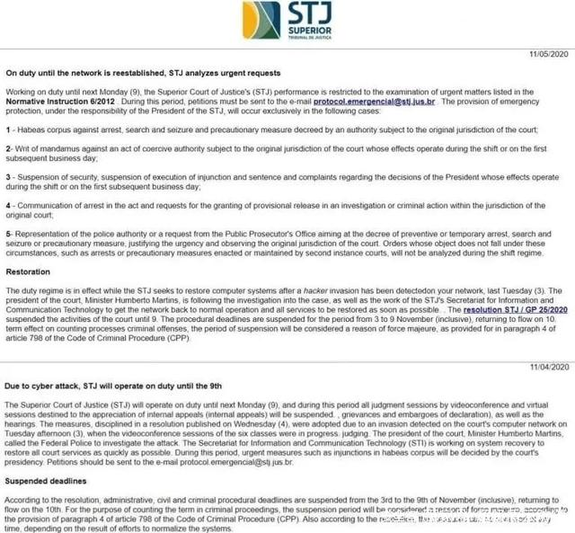 在遭到攻击的当下,STJ也建议所有的用户、管理人员或委外人员都不要使用连接该院系统的任何计算机。此外,该院预计休庭到本周一(11月9日),截止9日中午12点,巴西9日凌晨1点,STJ的官网尚未恢复运行。