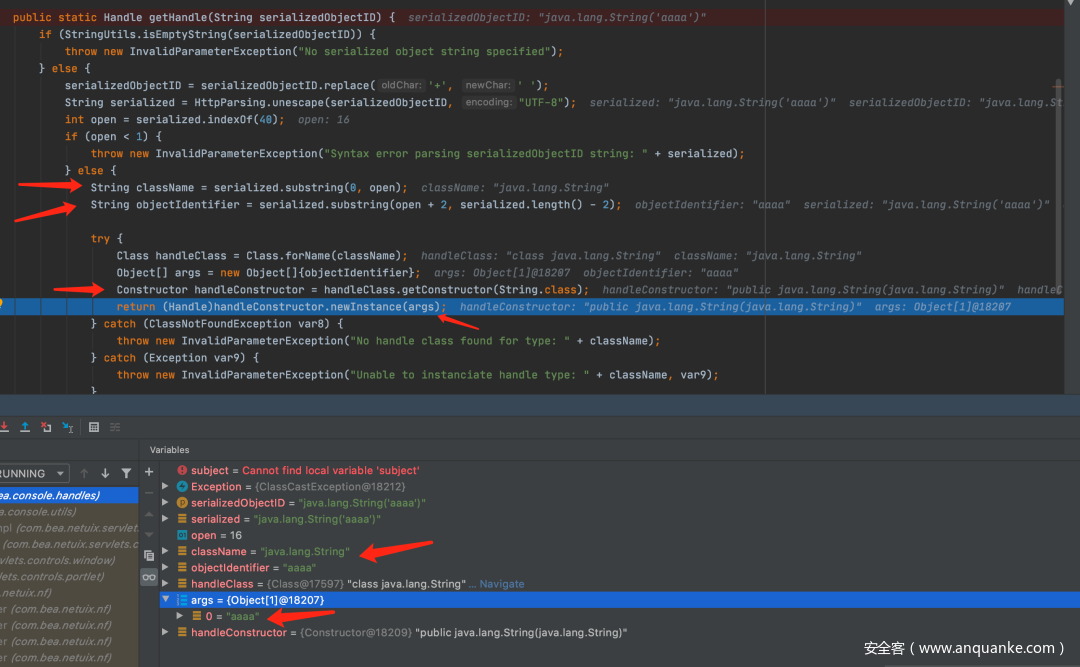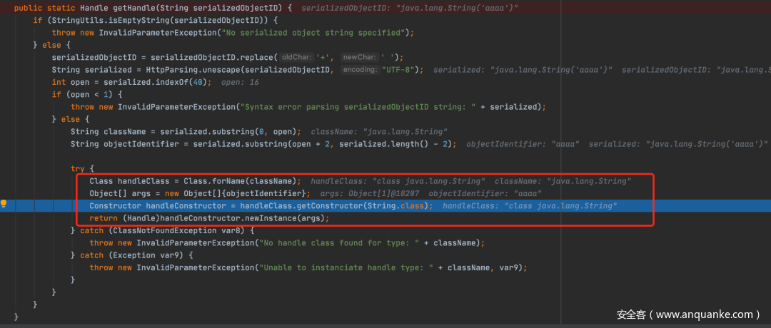 此时传进来的handleStr会在这里被拆成两部分,一个作为被实例化的类,另一个作为该类的构造函数参数及实例化,比如java.lang.String(‘aaaa’),被拆分成java.lang.String和aaaa
