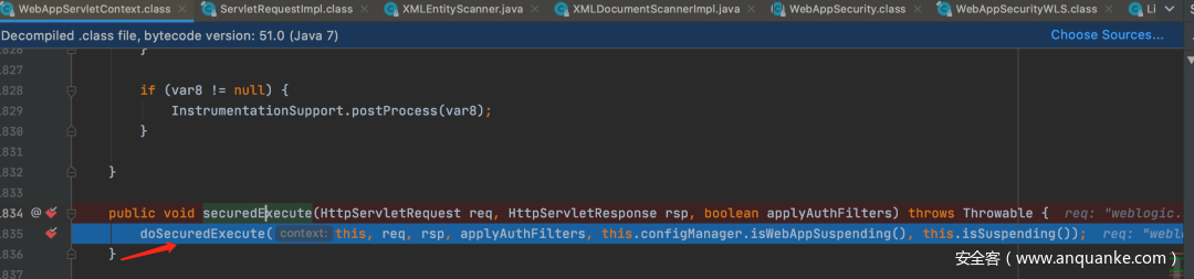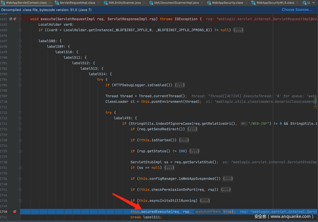 从绕过路径权限的校验开始。首先weblogic的请求会经过weblogic.servlet.internal.WebAppServletContext#execute处理,这里会调用securedExecute()