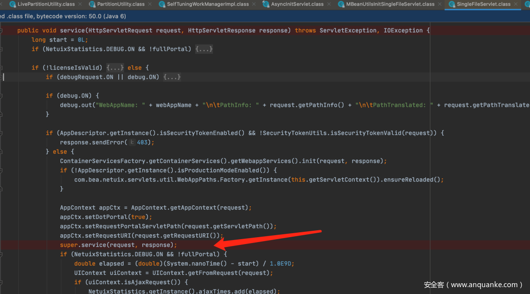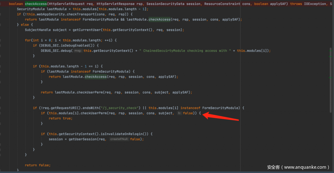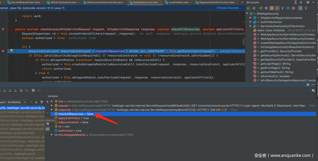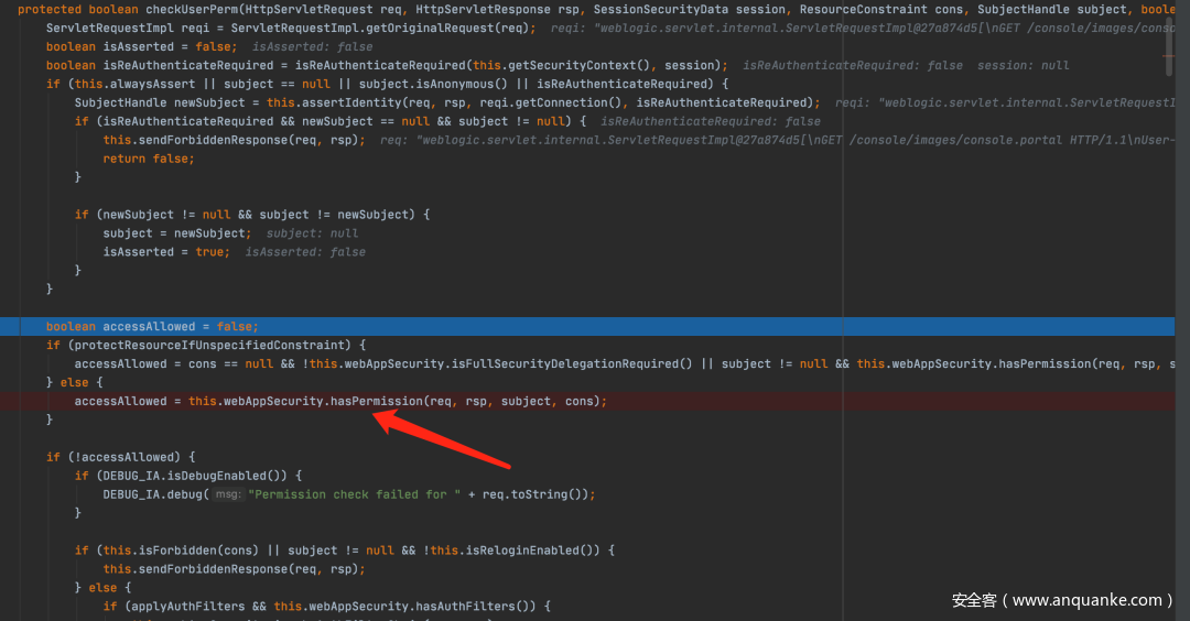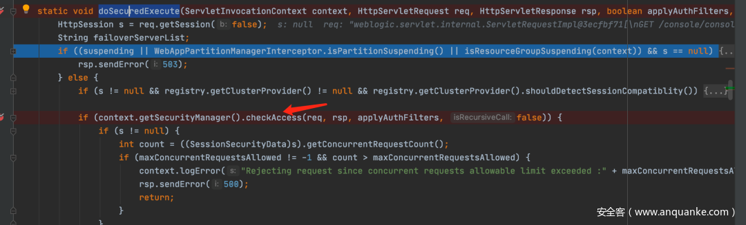 进入weblogic.servlet.security.internal.WebAppSecurity#checkAccess()中可以看到当我们请求的路径为/console/console.portal时,checkAllResources为false