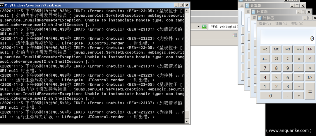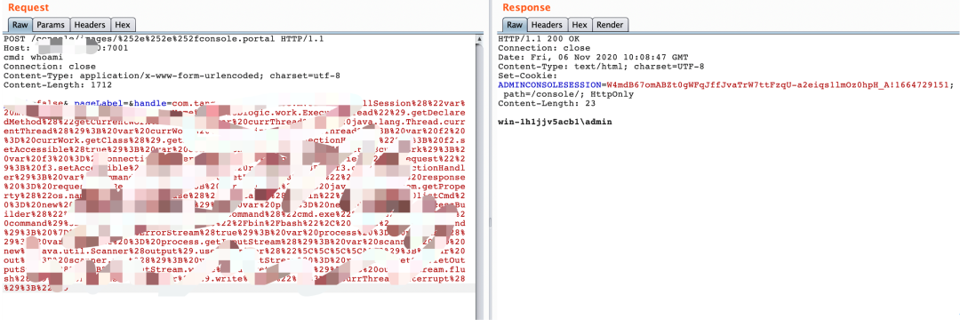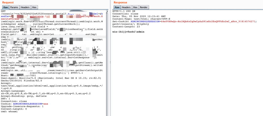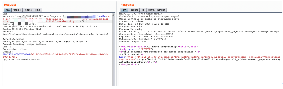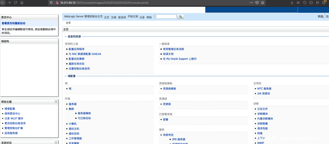WebLogic是美国Oracle公司的主要产品之一,是商业市场上主要的 J2EE 应用服务器软件,也是世界上第一个成功商业化的J2EE应用服务器,在 Java 应用服务器中有非常广泛的部署和应用。10月21日,Oracle官方发布数百个组件的高危漏洞公告。其中组合利用CVE-2020-14882/ CVE-2020-14883可使未经授权的攻击者绕过WebLogic后台登录等限制,最终远程执行代码接管WebLogic服务器,利用难度极低,风险极大。此处漏洞均存在于WebLogic的控制台中。该组件为WebLogic全版本自带组件,并且该漏洞通过HTTP协议进行利用,CVE-2020-14882漏洞允许未授权的用户绕过管理控制台的权限验证访问后台,CVE-2020-14883允许后台任意用户通过HTTP协议执行任意命令。