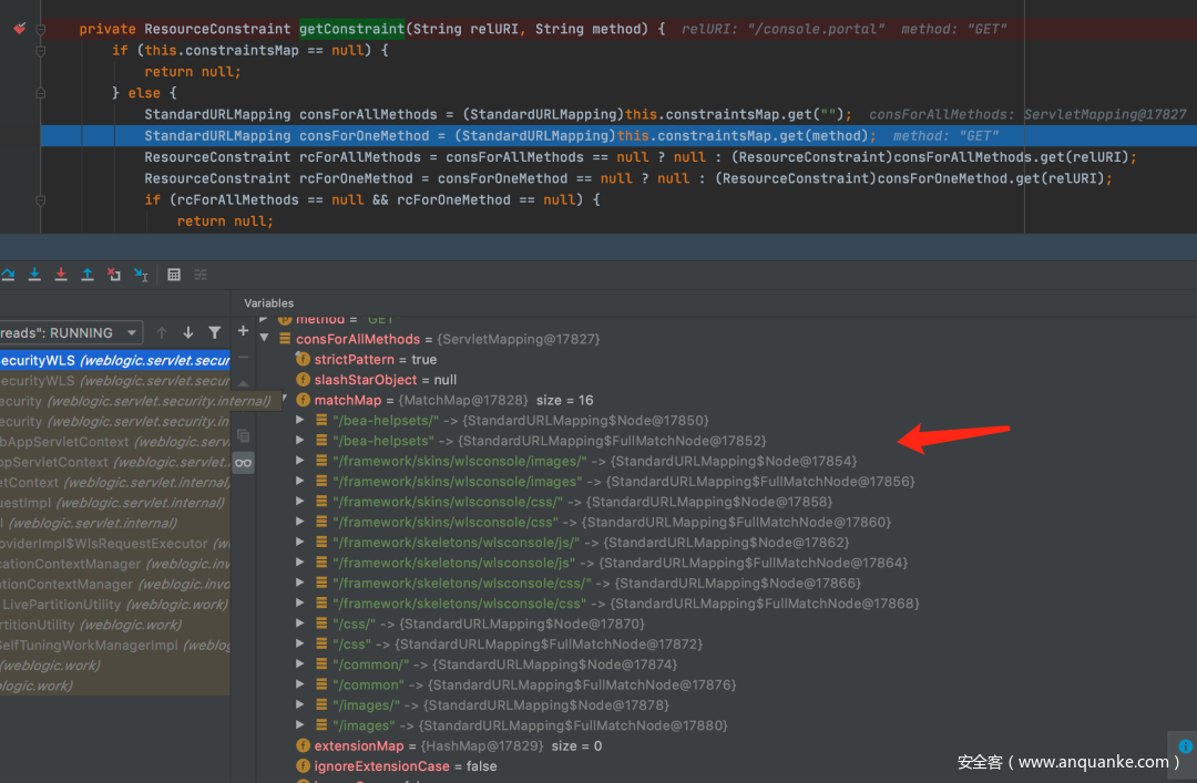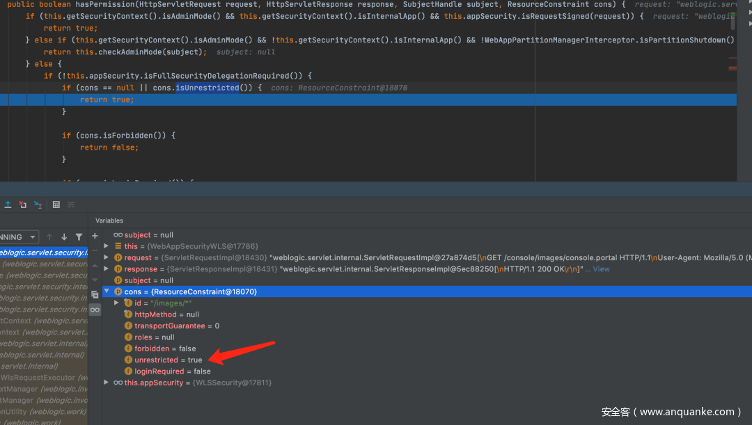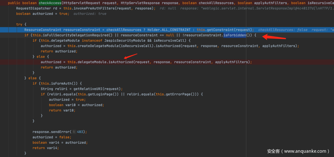 如果使用console/images/console.portal则会继续判断resourceConstraint及后续的isAuthorized,并进入weblogic.servlet.security.internal.ChainedSecurityModule#checkAccess