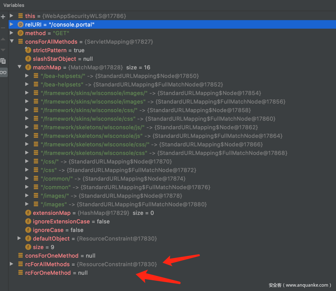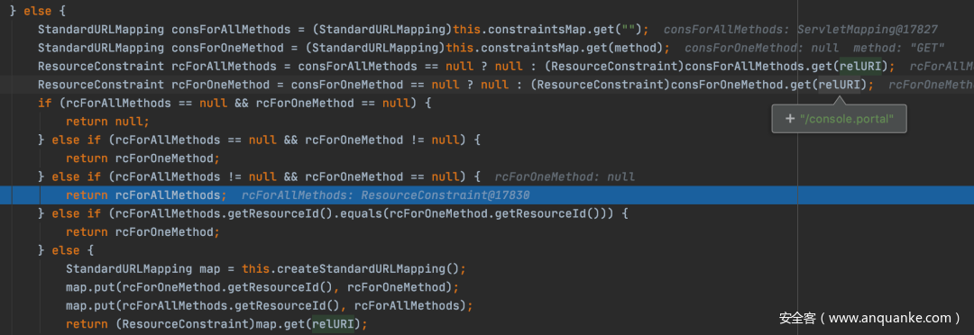 当我们的relURI为/console.portal时,rcForAllMethods不为null,rcForOneMethod为null,所以返回了rcForAllMethods。而对应静态资源就不会有限制和校验