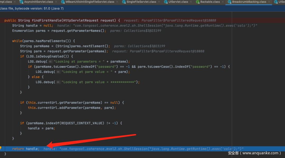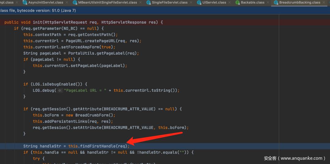 之后来到com.bea.console.utils.BreadcrumbBacking#init类,进入findFirstHandle