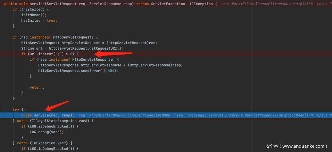 这里如果解码后的url里没有;,那么就会继续调用super.service