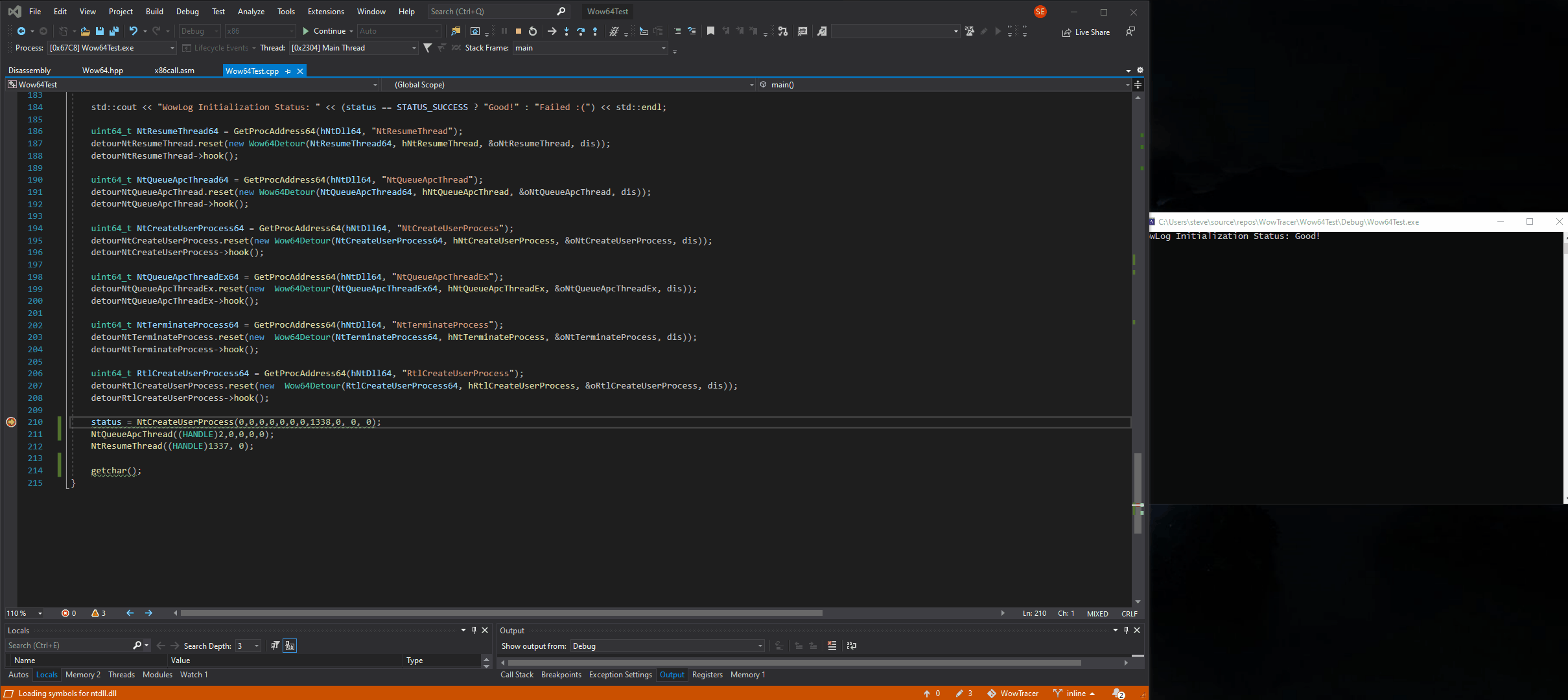 这样,我们就得到了简洁的回调stub,其功能与内联hook的功能完全相同,但不需要修改汇编代码。其实,参数也可以很容易被操纵,但返回状态可能无法修改,除非对堆栈的访问做了手脚。另外需要注意的是,wow64log DLL本身需要精心设计,以避免用到任何CRT机制: