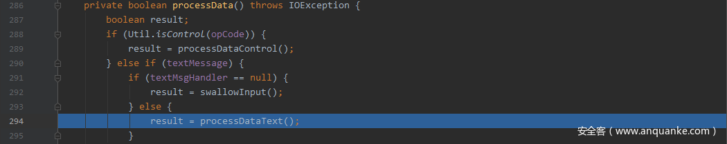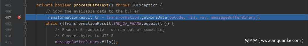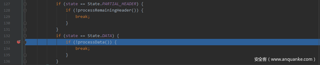 当处理完payload len之后,当前state=State.DATA,由于已经计算出payload data的长度,此时需要用payload len来处理payload data,在processData函数增加断点,并跟踪进去