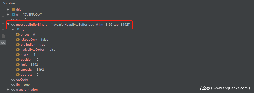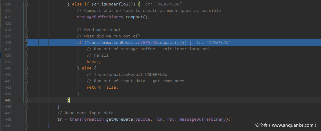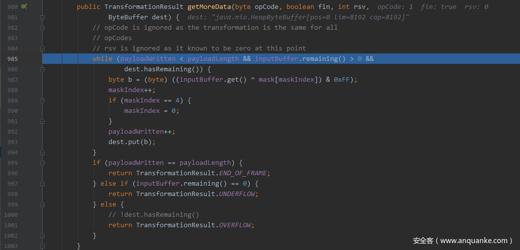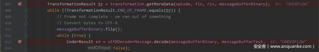 由于payload len为负数,导致取payload data时返回的TransformationResult.OVERFLOW,从而utf-8解码的这个循环结束,再次调用tr = transformation.getMoreData(opCode, fin, rsv, messageBufferBinary);,进入读取payload data的循环,由于返回值依然是OVERFLOW,这样就进入了无限循环,导致CPU爆满,那么为什么OVERFLOW状态会导致这个循环的无限执行呢?