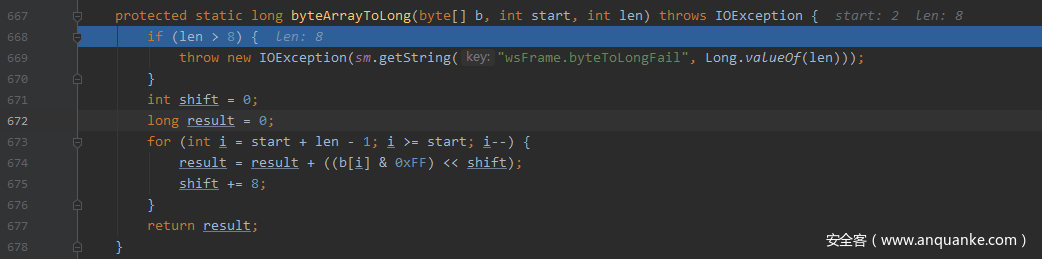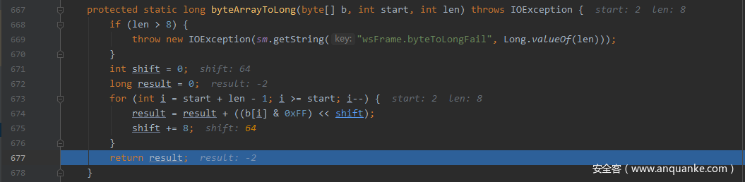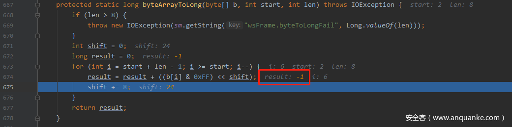 这里start=2 len=8,也就是正好取出了Websocket数据包的16位之后的64位数据,也就是Extended Payload Length进行计算,每次取低8位进行byte到long的转换,由于long数据类型是64位有符号的Java原始数据类型,当计算到最高8位时,result将是一个负数,我们构造的数据包Extended Payload Length64位全为1,查看其结果
