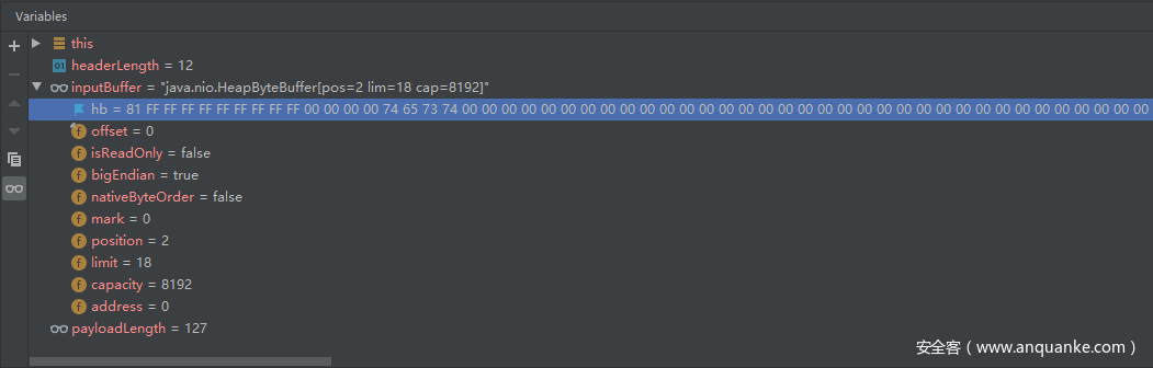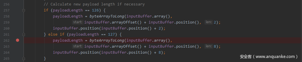 可以看到,inputBuffer就是我们发送的整个数据包,此时取出了其中的payload len为127,接着我们进入byteArrayToLong函数