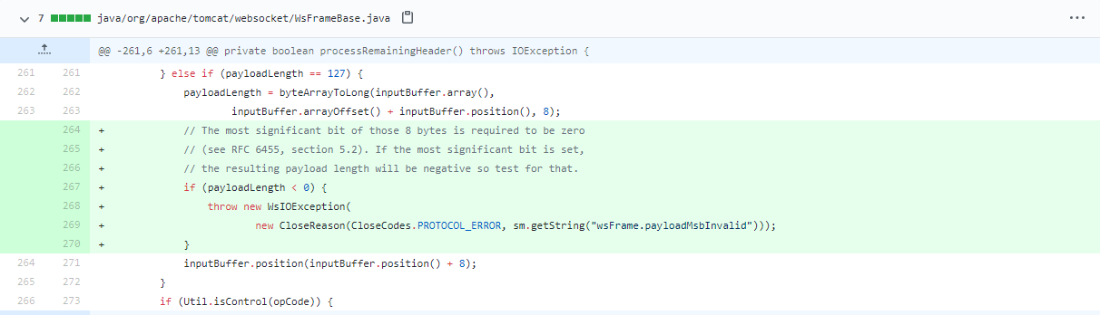 在org/apache/tomcat/websocket/WsFrameBase.java中的processRemainingHeader函数中,当payloadLength为127时,获取新的payloadLength,增加了非负的判断。