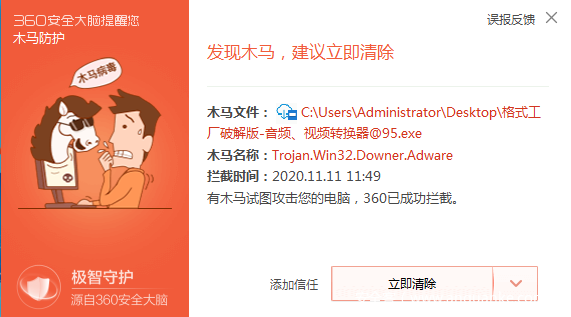 浏览器广告“泛滥”,木马植入、信息诈骗、强制消费等安全隐患接踵而至,污染网络环境之余,不仅侵犯了用户选择权,更严重威胁着网络安全。而在发现此类威胁后,360安全大脑极速出击,极智赋能360安全卫士,实现可在第一时间查杀此类恶意软件,保护广大用户上网安全。
