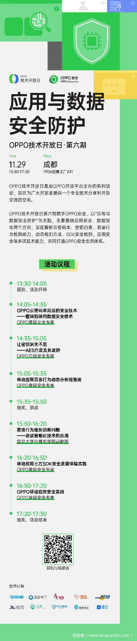 如何防止应用被暴力破解、如何为应用进行深层次的加固、如何进行应用SDK安全检测、如何实现AES加密算法原理等技术问题,OPPO安全将在本次技术开放日活动上为您一一揭晓。
