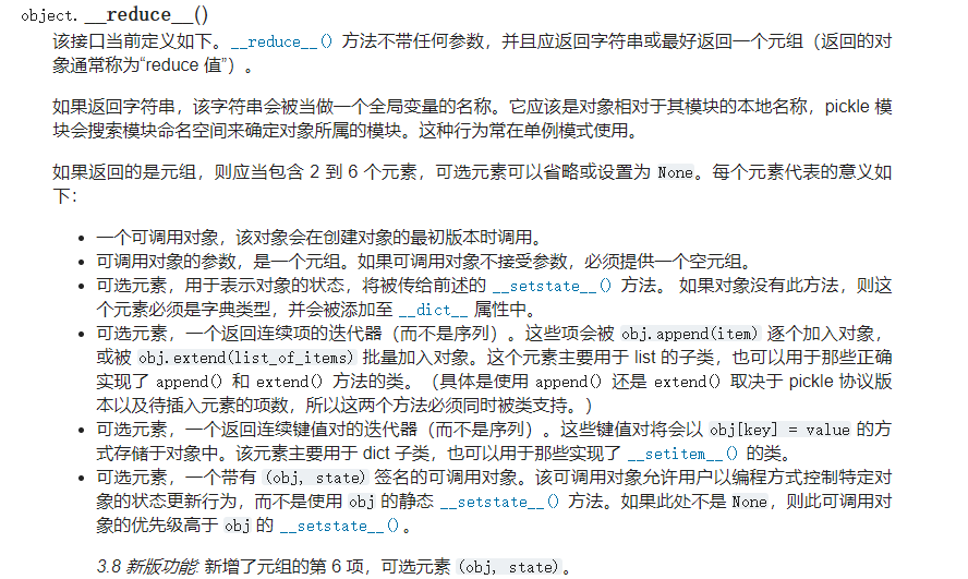反序列化漏洞出现在 reduce()魔法函数上,这一点和PHP中的__wakeup()魔术方法类似,都是因为每当反序列化过程开始或者结束时 , 都会自动调用这类函数。