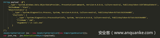 所以它是一个安全的序列化处理类,漏洞的触发点也是在于初始化JavaScriptSerializer类的实例的时候是否创建了SimpleTypeResolver类,
