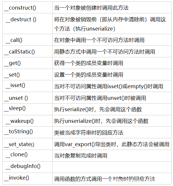 下面是比较典型的PHP反序列化漏洞中可能会用到的魔术方法: