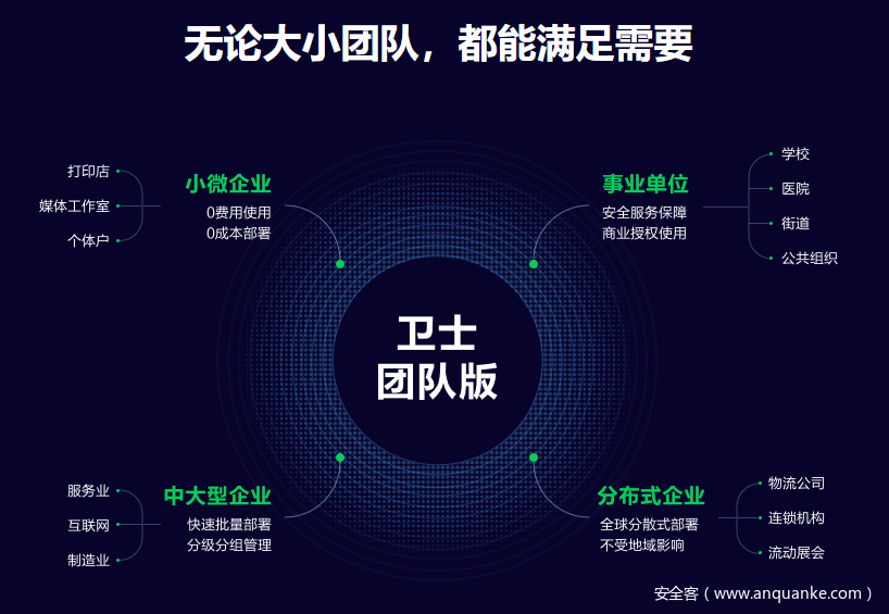相较于企业网络环境,校园网络作为重要的教育场景,不仅囊括硬件防护、软件防护、制度保障、教育跟进,还涉及信息过滤等环节,因此也就对传统的终端类防护产品提出了更高的要求。而360安全卫士团队版作为360政企安全集团全新发布的新一代终端安全管理方案,在360安全大脑的极智赋能下,推出内网渗透防护、弱口令保护、漏洞修复等功能,为学校等多领域用户带来内网威胁的“隔离墙”,阻断病毒木马等多种威胁。