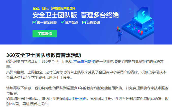 鉴于上述情况,360政企安全集团特别推出“360安全卫士团队版 · 青少年守护计划”,并以认证授权的方式向全国范围内的中小学校,提供免费安装部署、免费使用教育专版功能、免费提供专家技术服务,最少一年时间,加码教育产业网络安全建设。即日起,教育领域用户可前往(https://tools.soft.360.cn/jump?id=108)登记注册,享受360安全卫士团队版教育专属服务,携手护航全国中小学校绿色网络环境。