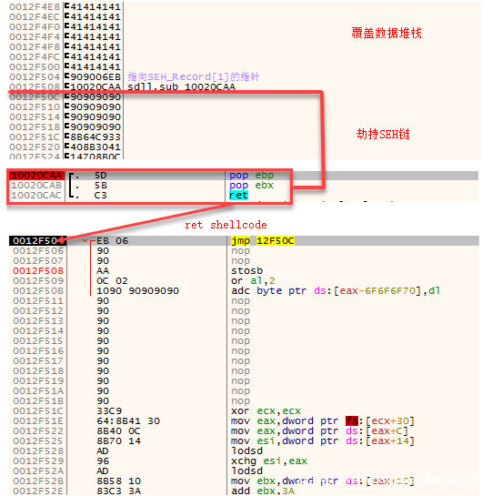 fscanf函数读取sydb.pls文件数据后,覆盖了当前函数返回地址和SEH的回调函数。当函数返回时,由于返回地址0x41414141是一个无法访问的地址,触发异常从而跳入被覆盖的SEH回调函数,而回调函数地址是sdll.dll的一个固定地址,运行其中两个pop一个ret后又跳回之前被覆盖地址中构造好的shellcode中继续执行。