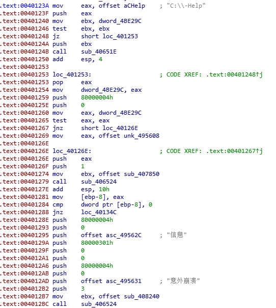 该木马首先会检测自身文件是否以字符“–”开头。木马启动后会在C盘根目录下创建以木马文件名第一个字母+字符串“Help”的文件,然后检测C:\\-Help文件是否存在,不存在则弹窗“意外崩溃”并退出程序,用来对抗分析。