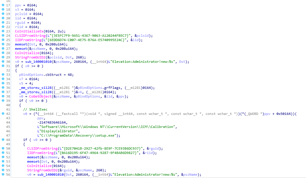 6.执行 C:\\ProgramData\\Recovery\\go.exe 这是一个bypassuac程序.这个程序的主要目的就是启动官方的安装程序setup.exe,以此来迷惑用户。