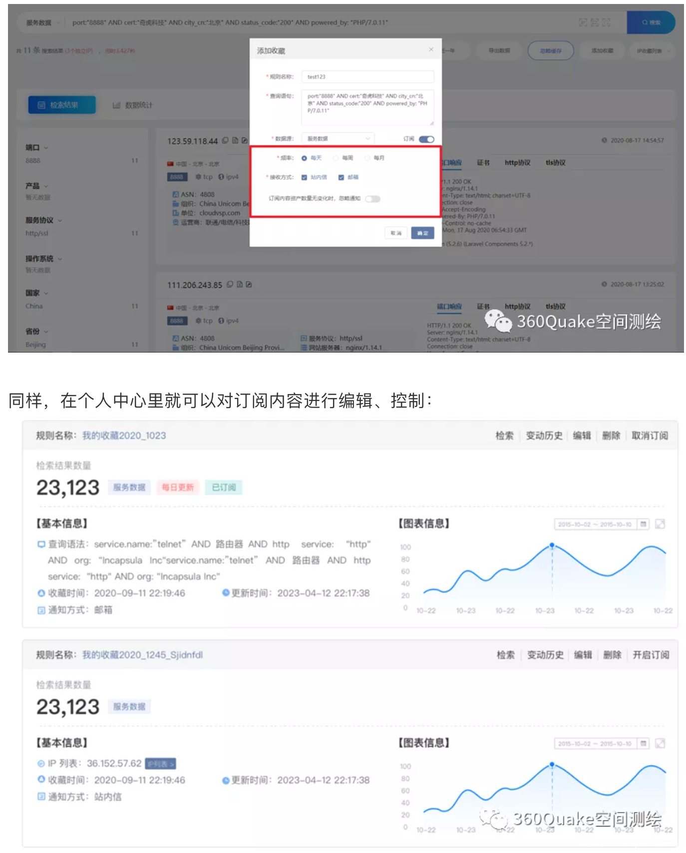 在批量搜索弹窗中,点击按钮“收藏并检索“,将会与之前的收藏订阅功能联动。想想就很期待,因为这样我们就可以掌握特定IP列表的变动情况。
