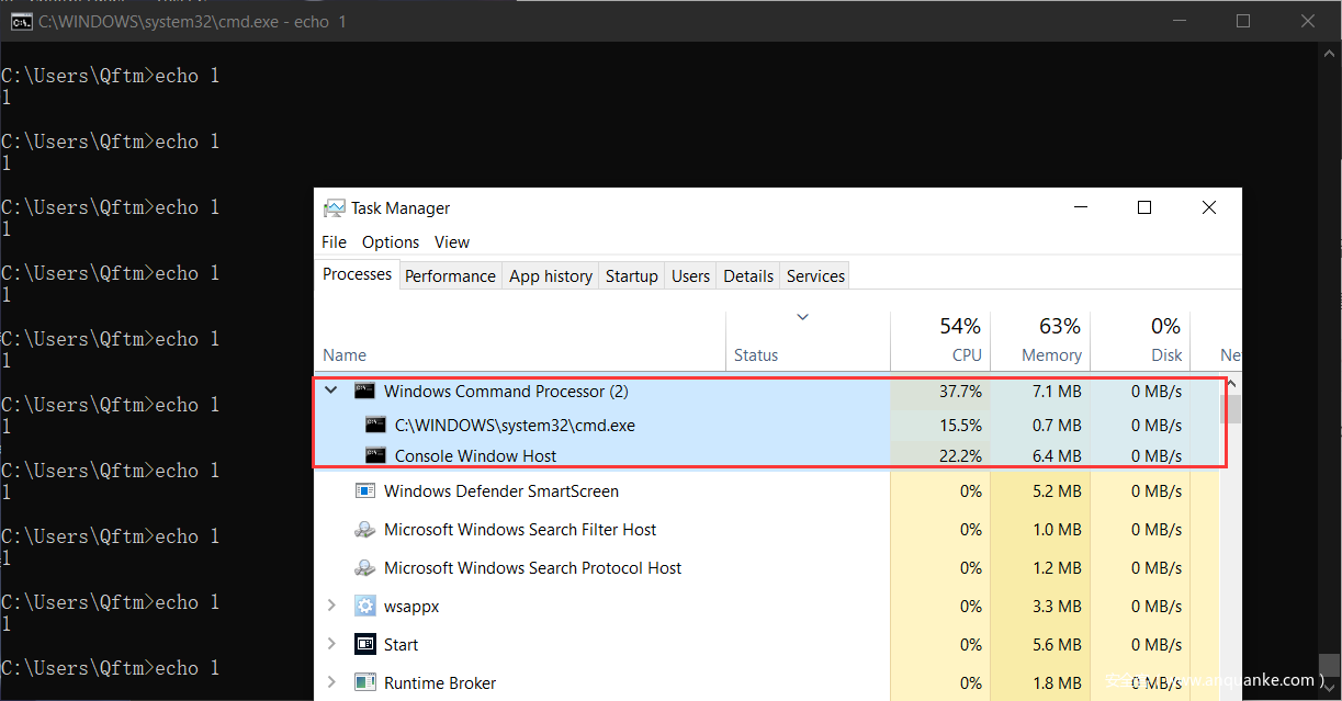 另一侧,打开任务管理进行cmd终端的监控,可以发现echo指令为终端内置封装的指令,并未出现外部调用