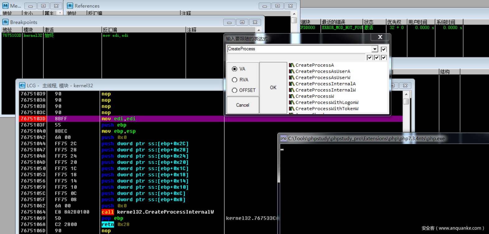 使用OD动态调试,加载php.exe程序,对相关创建进程的系统API下断点(如果不知道是那个CreateProcess API可以把查询到的都进行断点即可)