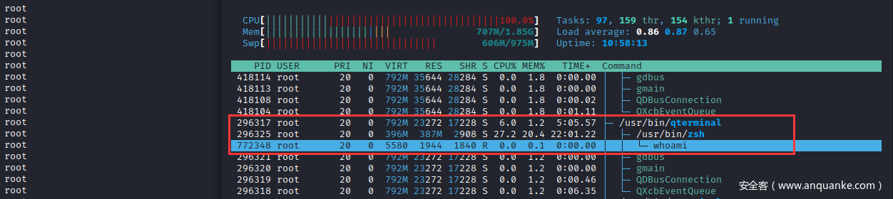 另一侧,打开任务管理进行cmd终端的监控,可发现whoami指令并非cmd.exe终端内置封装的指令