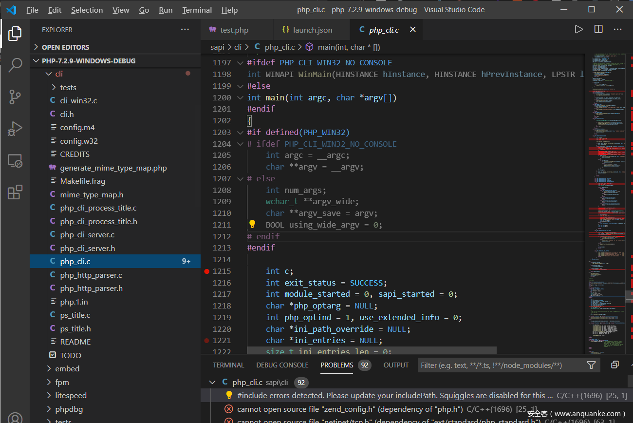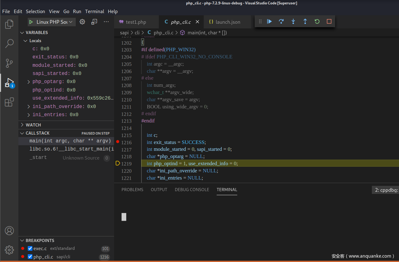 打开php-7.2.9-linux-debug/sapi/cli/php_cli.c源文件,定位到1200行的main函数内打上断点。【在想要调试的源代码特定位置上打上特定的断点即可】