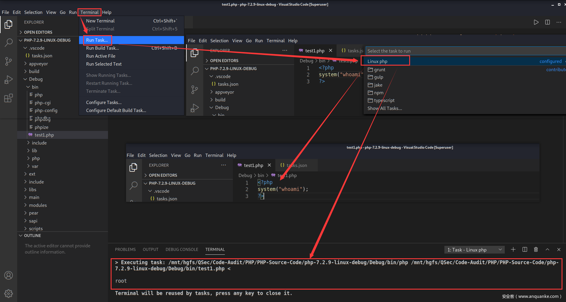 同PHP for Windows->源码执行->任务执行创建相应的tasks.json任务文件,修改配置如下