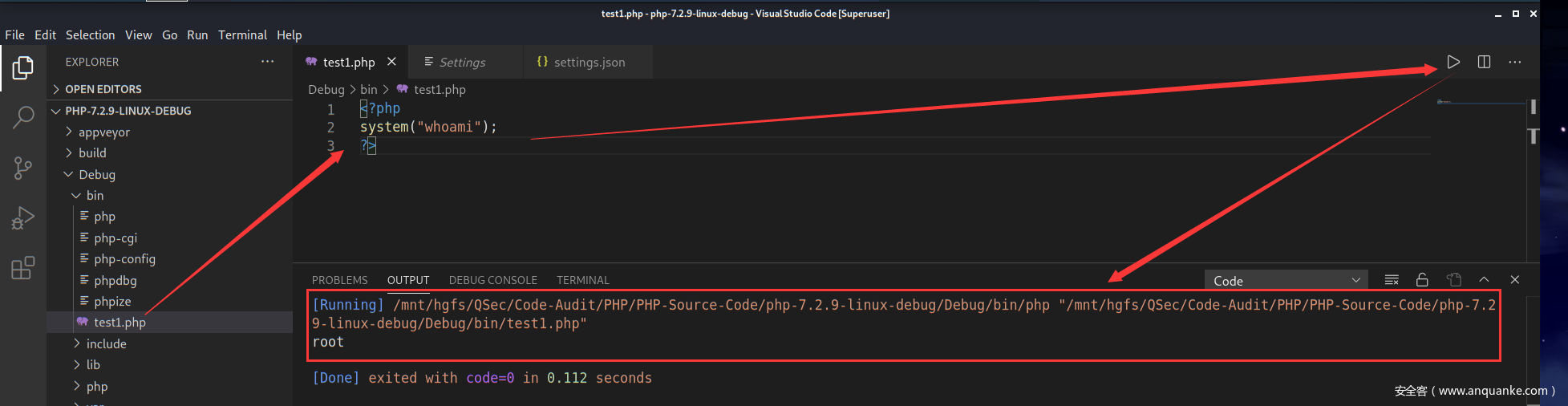 生成configure脚本文件后,就可以开始编译了。为了调式PHP源码,这里同PHP for Windows部分,编译disable所有的扩展(除了一些必须包含的),使用下面的命令来完成编译安装的工作,安装的路径为/mnt/hgfs/QSec/Code-Audit/PHP/PHP-Source-Code/php-7.2.9-linux-debug/Debug: