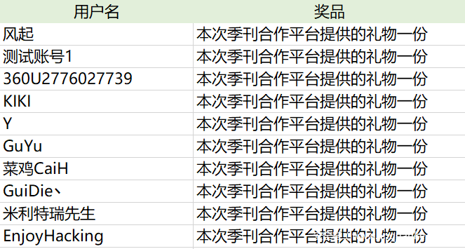 注意:尚未在抽奖页面填写收货地址的同学,请在1月20日前进入安全客用户交流6群:785695539,联系群主@安全客发送你的昵称+地址+邮箱。过期不候哦~ ~请仔细阅读我们的贴心tips。有问题及时与安全客的小伙伴沟通联系。
