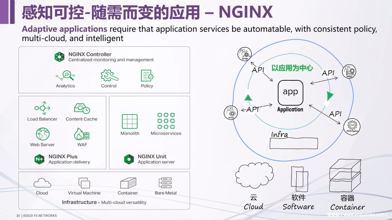 开发初期,NGINX以应用为中心,强调云端部署、软件化、容器化,因而在支持多云应用方面,NGINX拥有先天的优势。