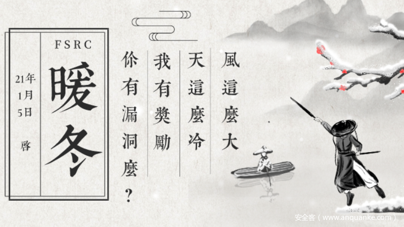 FSR的活动给各位白帽提供全方位武装不会被严寒和暴雪所困扰。