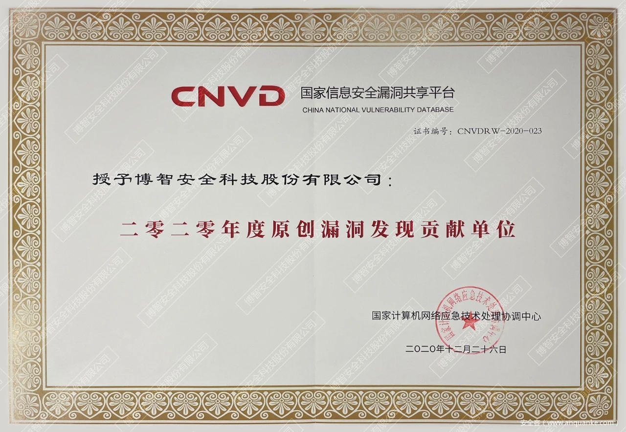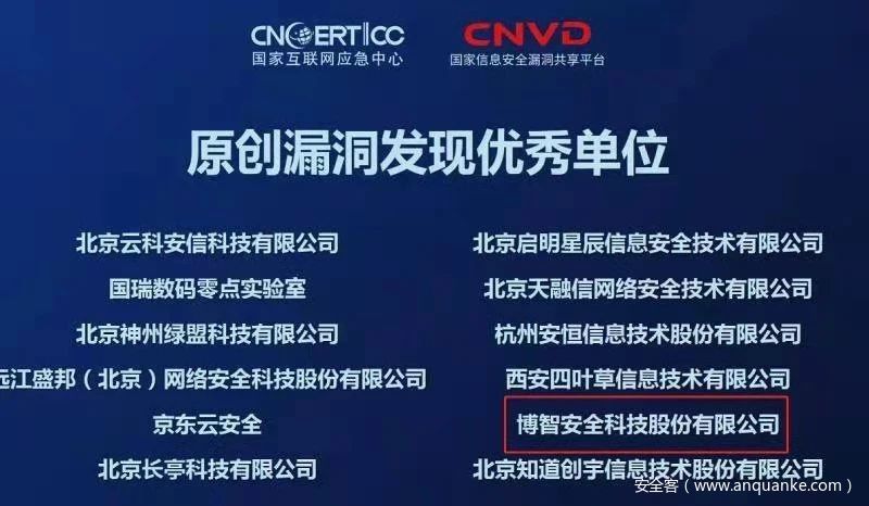 2020年12月30日,由国家互联网应急中心(以下简称”CNCERT“)主办的国家信息安全漏洞共享平台(以下简称“CNVD”)2020年度工作会议在线成功召开。会议对2020年CNVD漏洞工作进行了全面总结,对漏洞信息报送和处置突出贡献单位进行了表彰。博智安全科技股份有限公司(以下简称“博智安全”)凭借强大的漏洞挖掘和响应处置能力荣获原创漏洞发现优秀单位、2020年度原创漏洞发现贡献单位两项大奖。