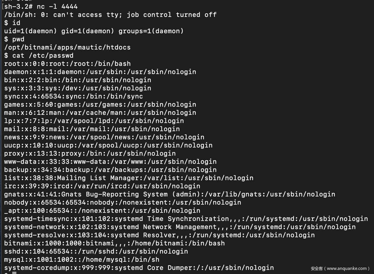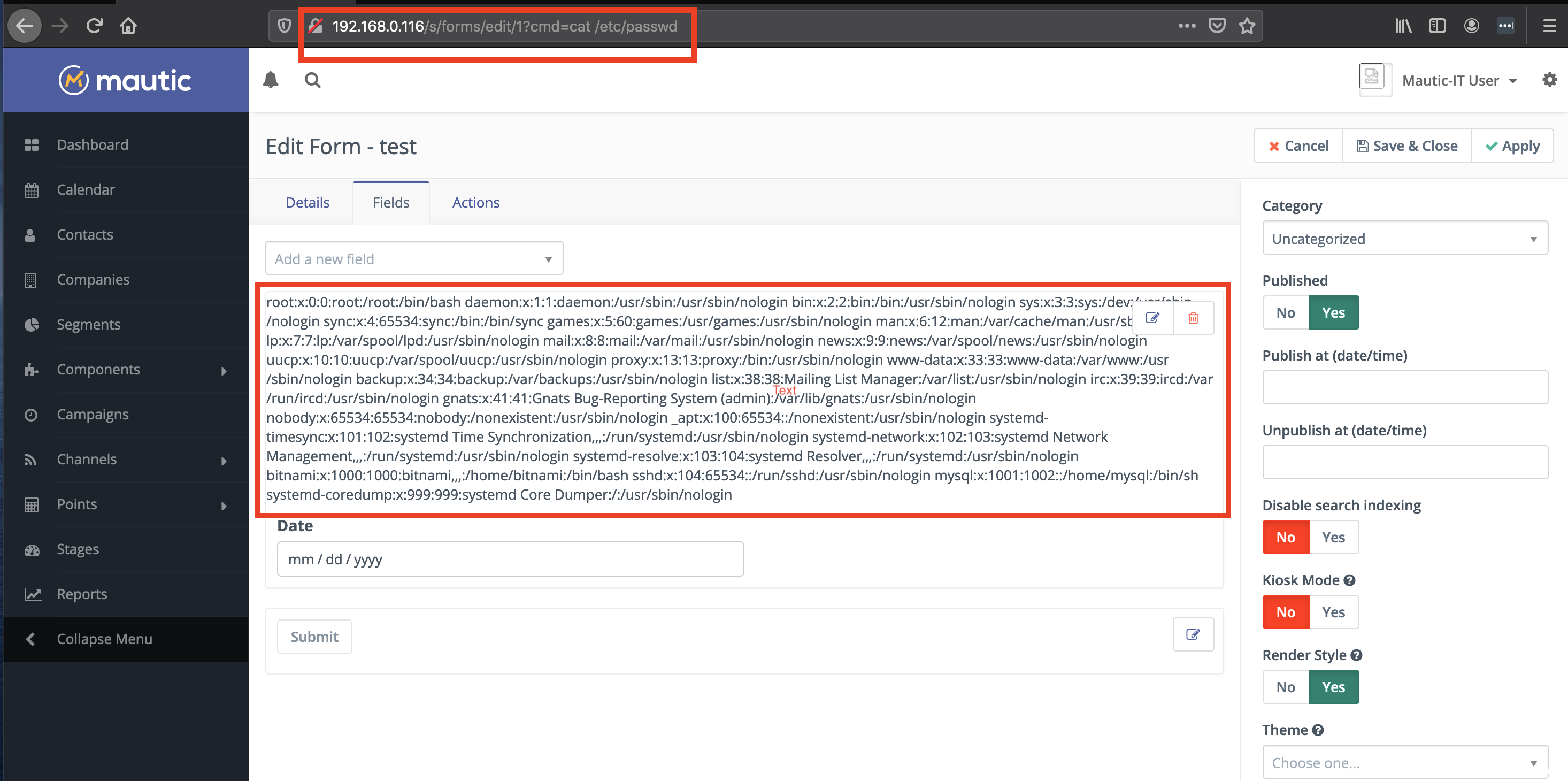 为了激活Web Shell,我们首先需要使用自定义Date字段创建一个表单,然后再对其进行编辑。Web Shell会在/s/forms/edit/<form_id>页面被激活。下图中,我们导出了Mautic服务器中/etc/passwd文件的内容: