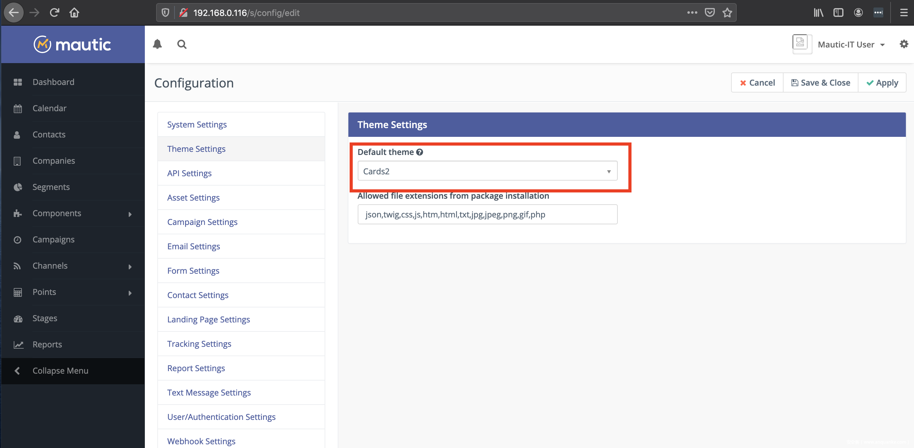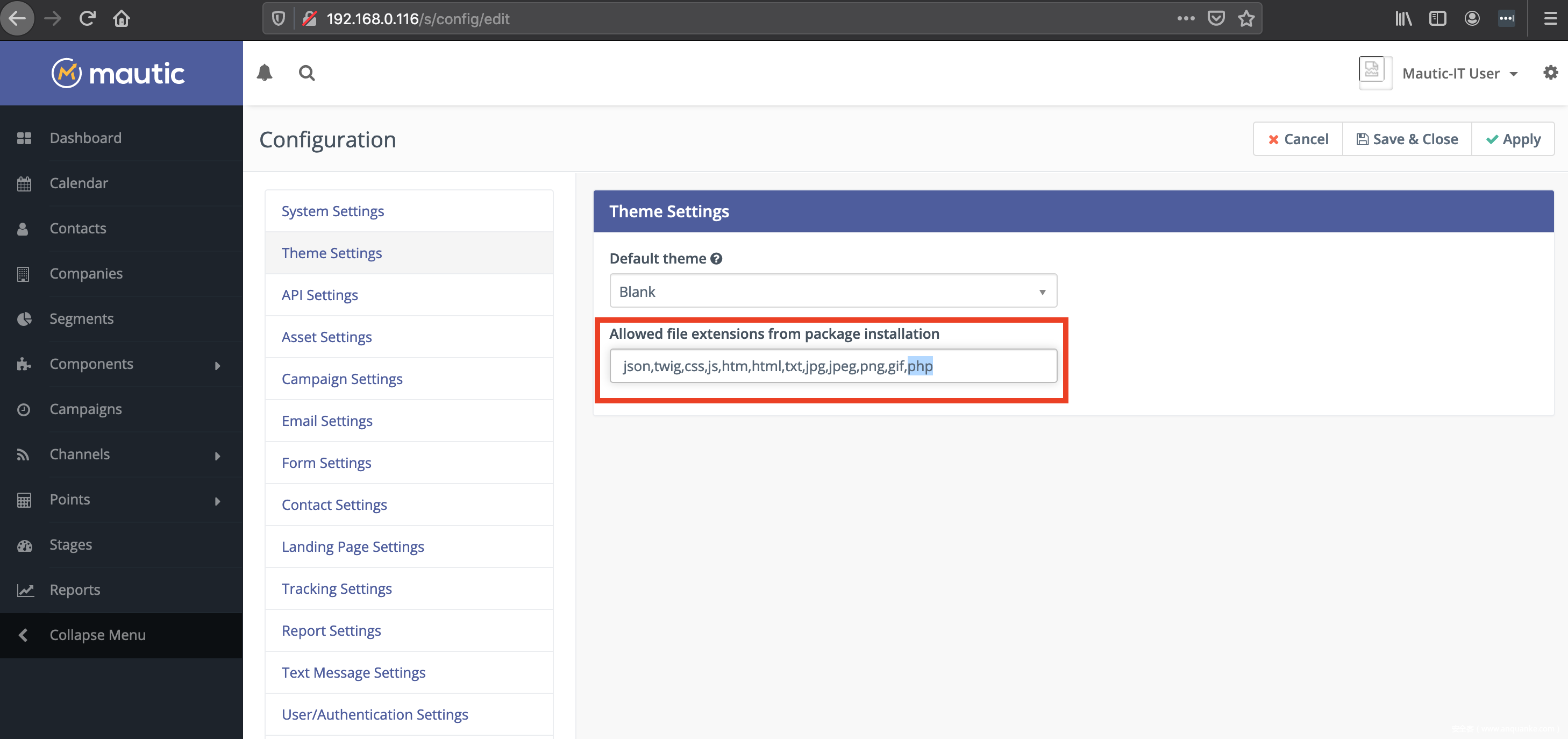 2028100 27 files为了激活主题,还需要修改Mautic主题配置以允许我们上传PHP文件: