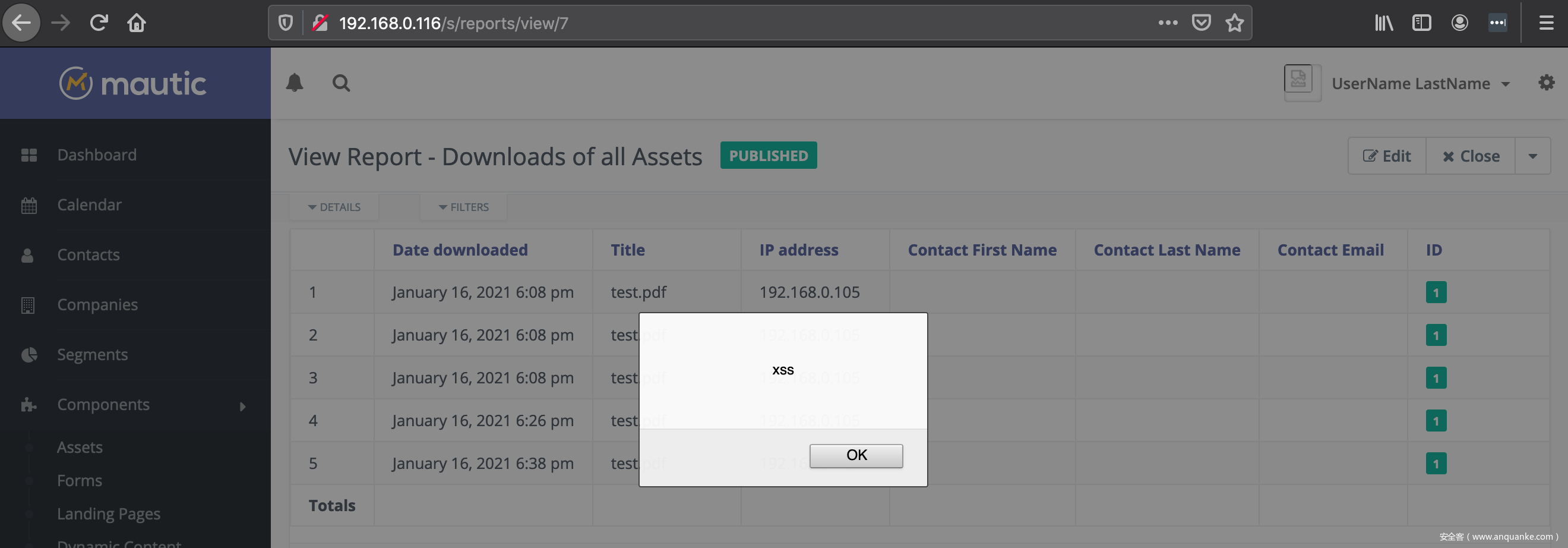 通过识别资产或表单,攻击者可以创建XSS Payload。现在,我们想要构造一个XSS Payload,并在合法的Mautic管理员用户查看“Downloads of all Assets”报告时自动创建一个管理员用户。