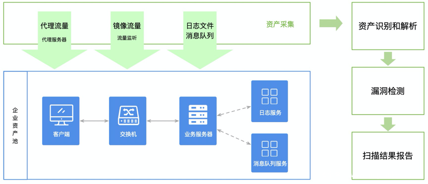 不受流量来源格式约束的通用被动流量解析模式,可满足不同企业各种流量格式扫描的需求,能够提供通用流量接收接口:客户端的流量、服务器端的流量、交换机镜像的流量、日志服务器的日志文件、其他信息采集方式(kafka、rabbitmq等)采集的资产信息,均可通过通用接口接入系统内部,最终解析成域名、服务、Web站点等,在资产管理模块进行展示;流量中的请求和服务端口可直接用于进行漏洞检测。